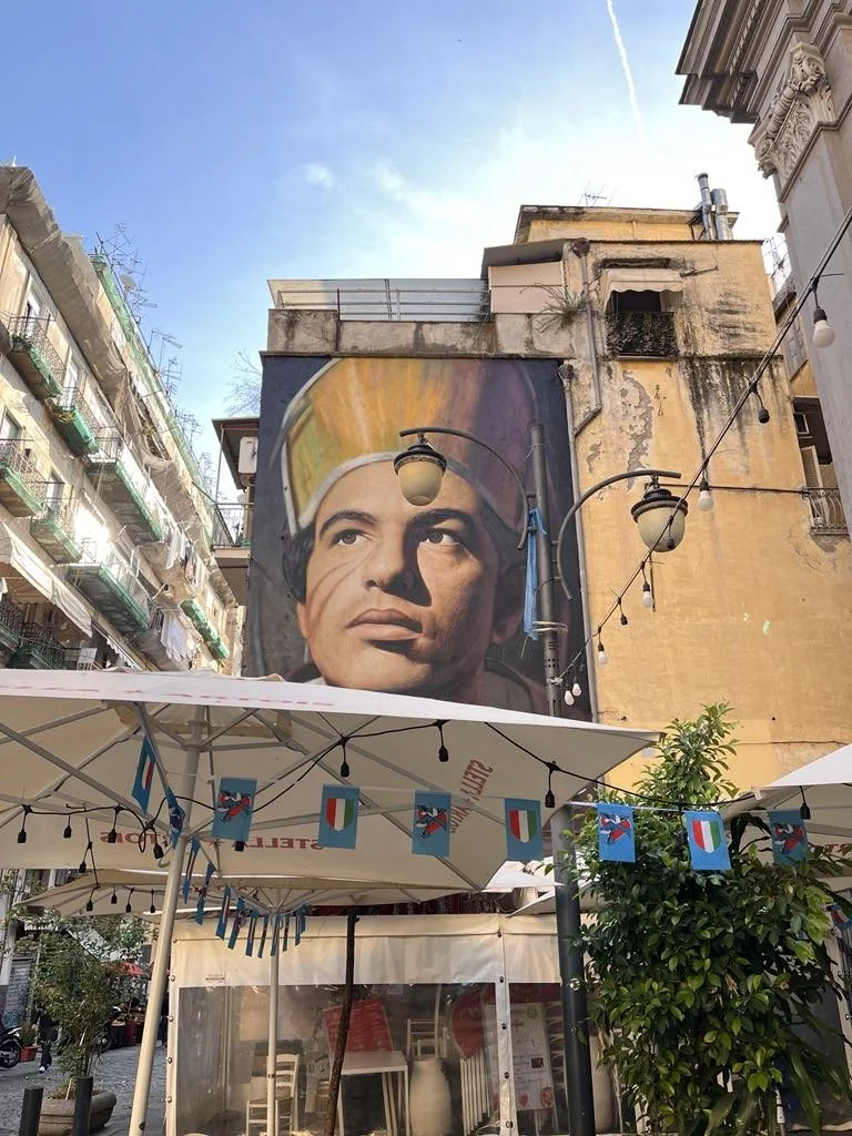 Still, the streets had character. As we walked deeper into the old city, we passed murals, shrines, t-shirts, and posters, all paying homage to Diego Maradona, Naples’ adopted god. One mural crowned him as the pope; another simply read, D10S, a play on his jersey number and the Spanish word for “God.” The reverence here is more than fandom. It’s devotion.